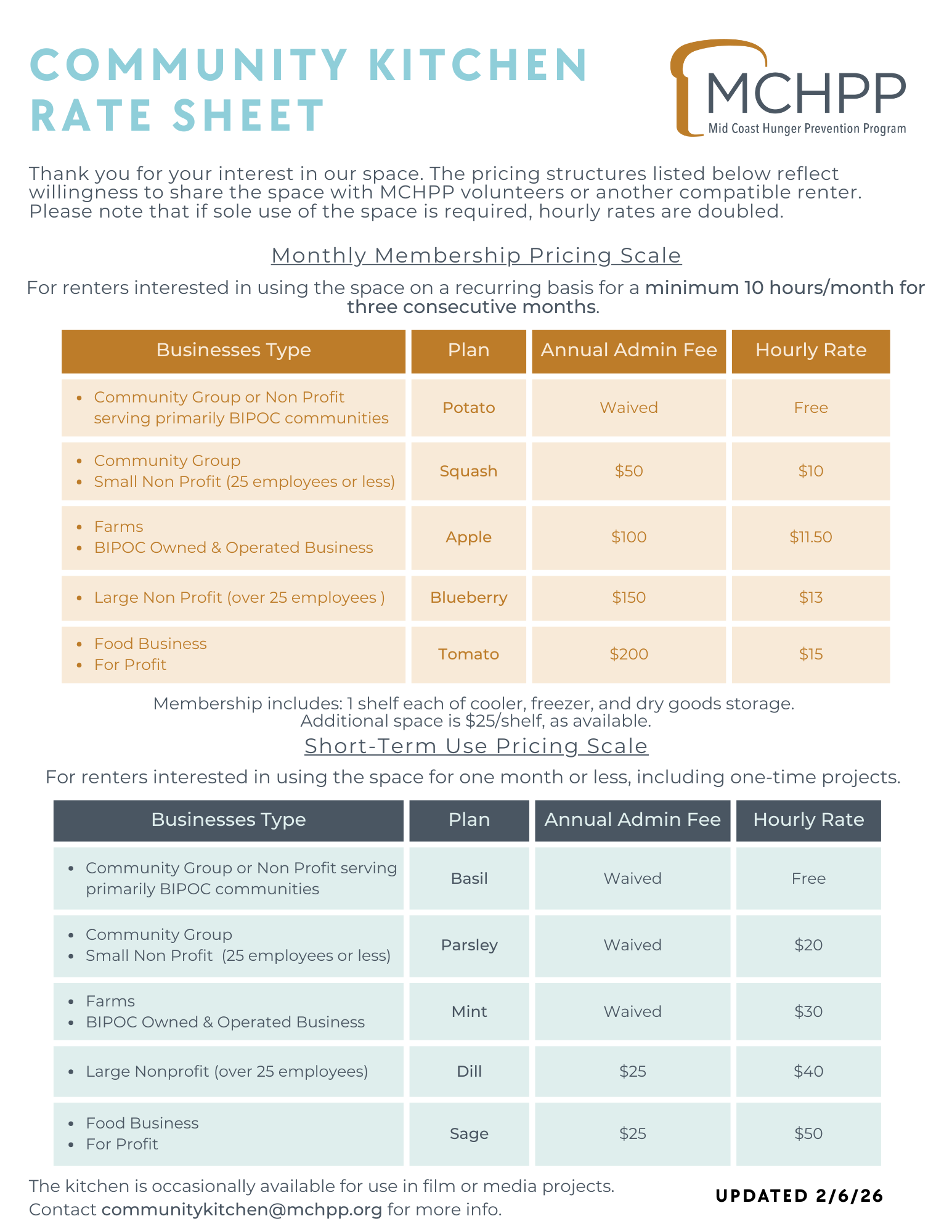 MCHPP provides restrooms, compost, laundry, trash, and recycling services as well as gloves, hairnets, and aprons for volunteers and renters. All utilities are included in the rental fee.