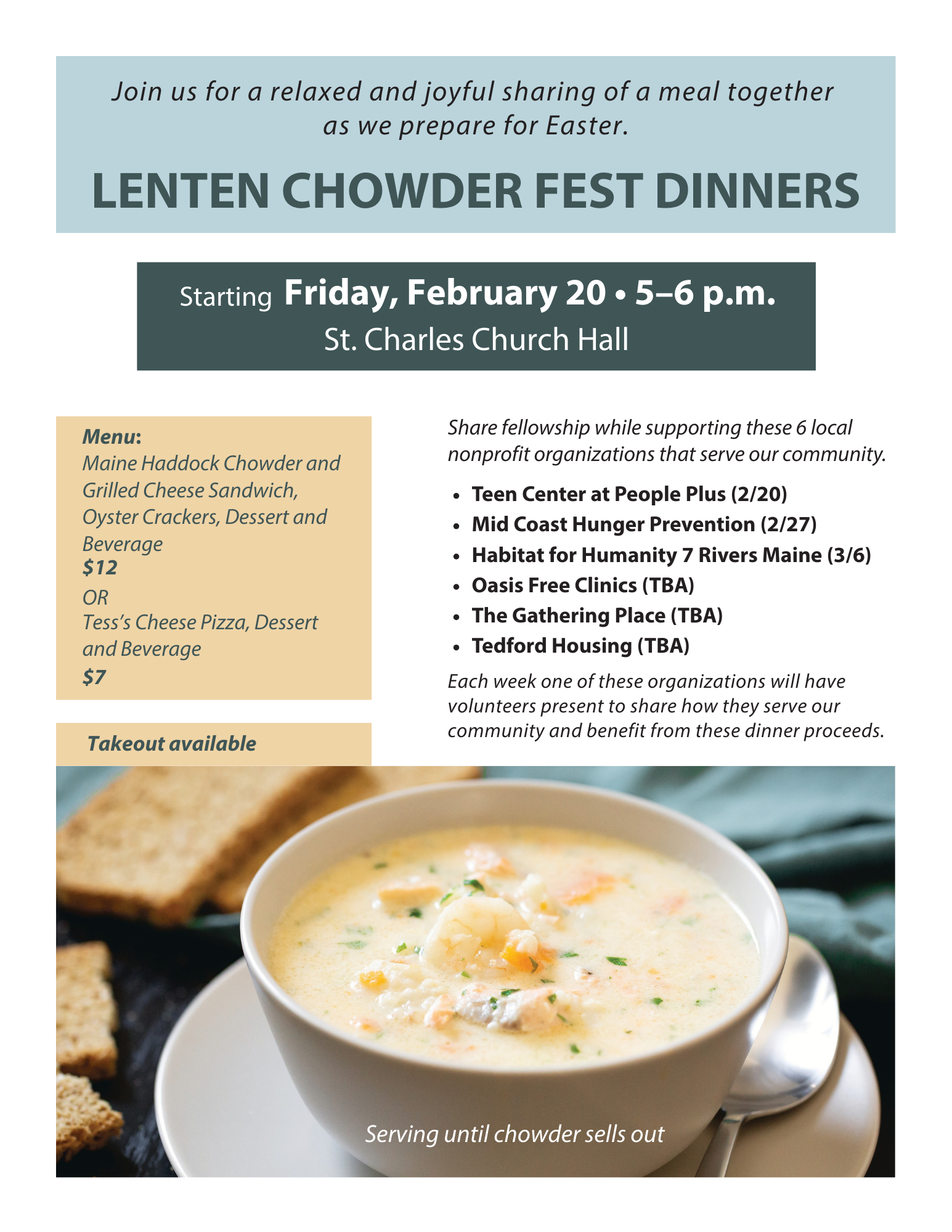 Beginning later this month, our friends at St. Charles and St. John’s Social Justice and Peace Commission are hosting Lenten Chowder Fest Dinners to support local nonprofit organizations 🍲
